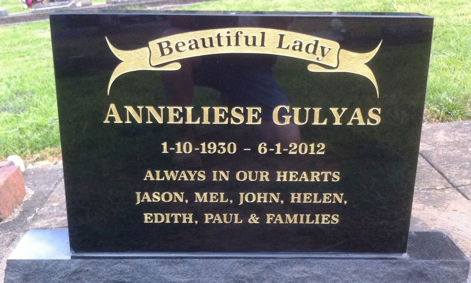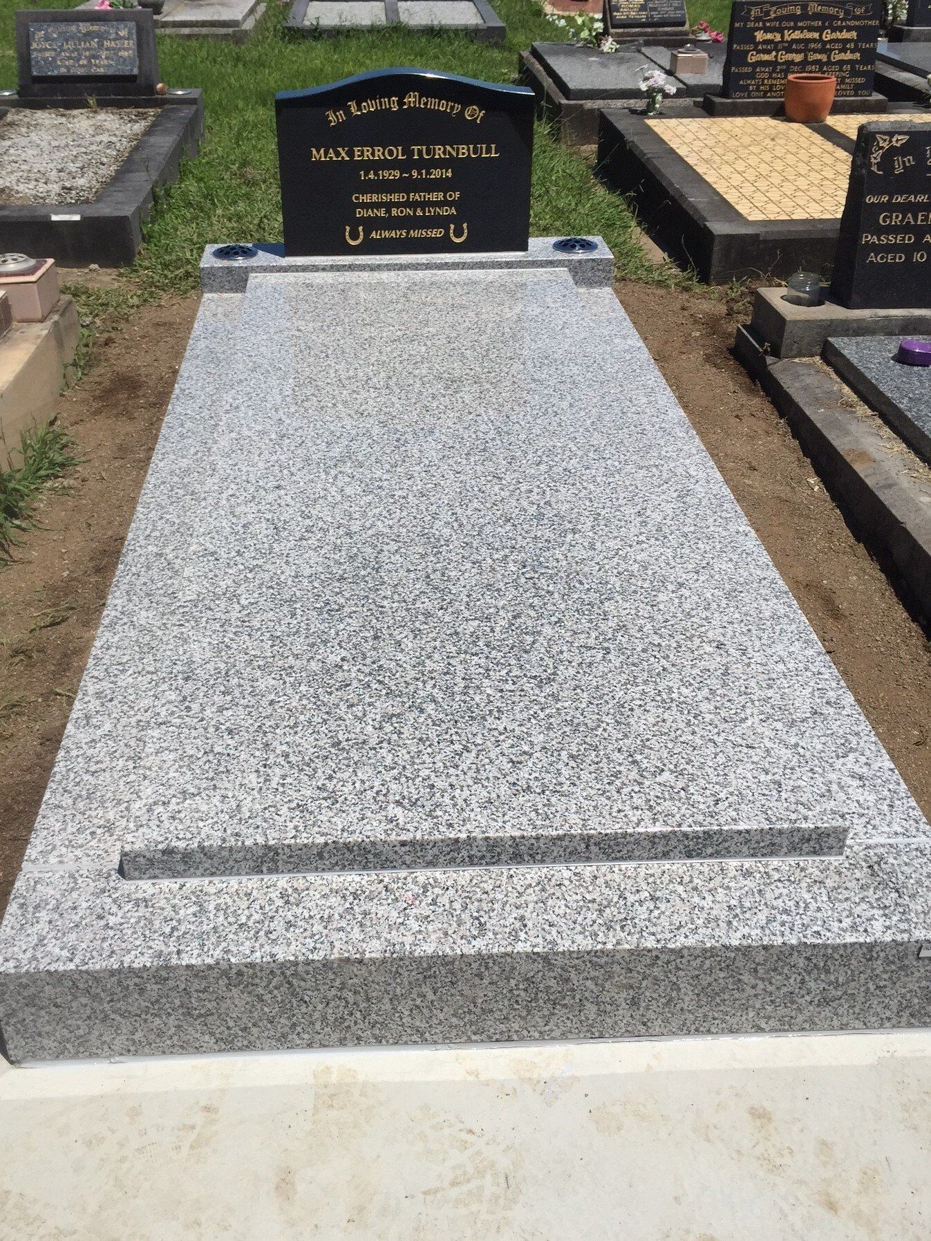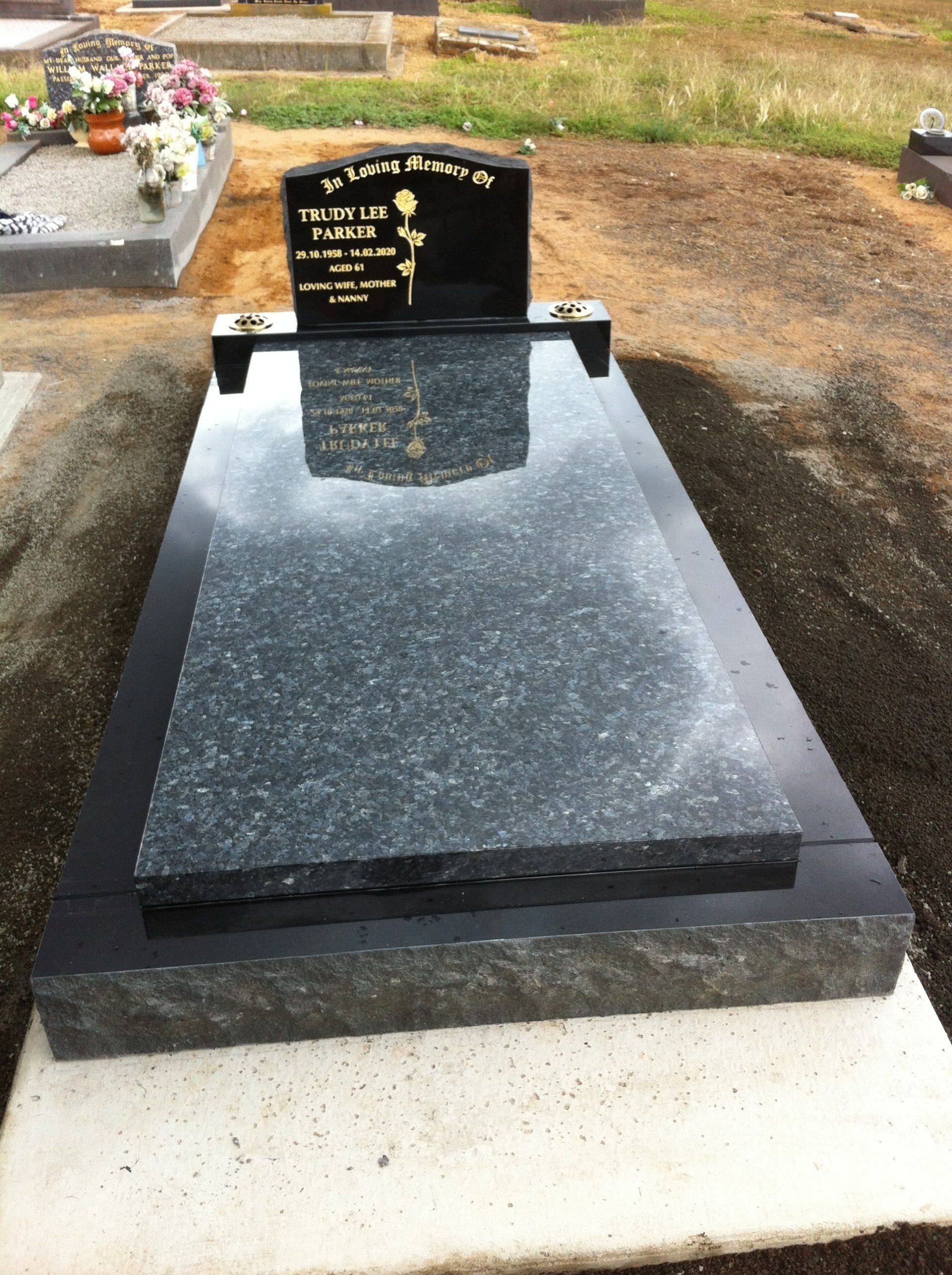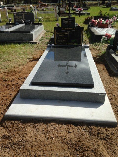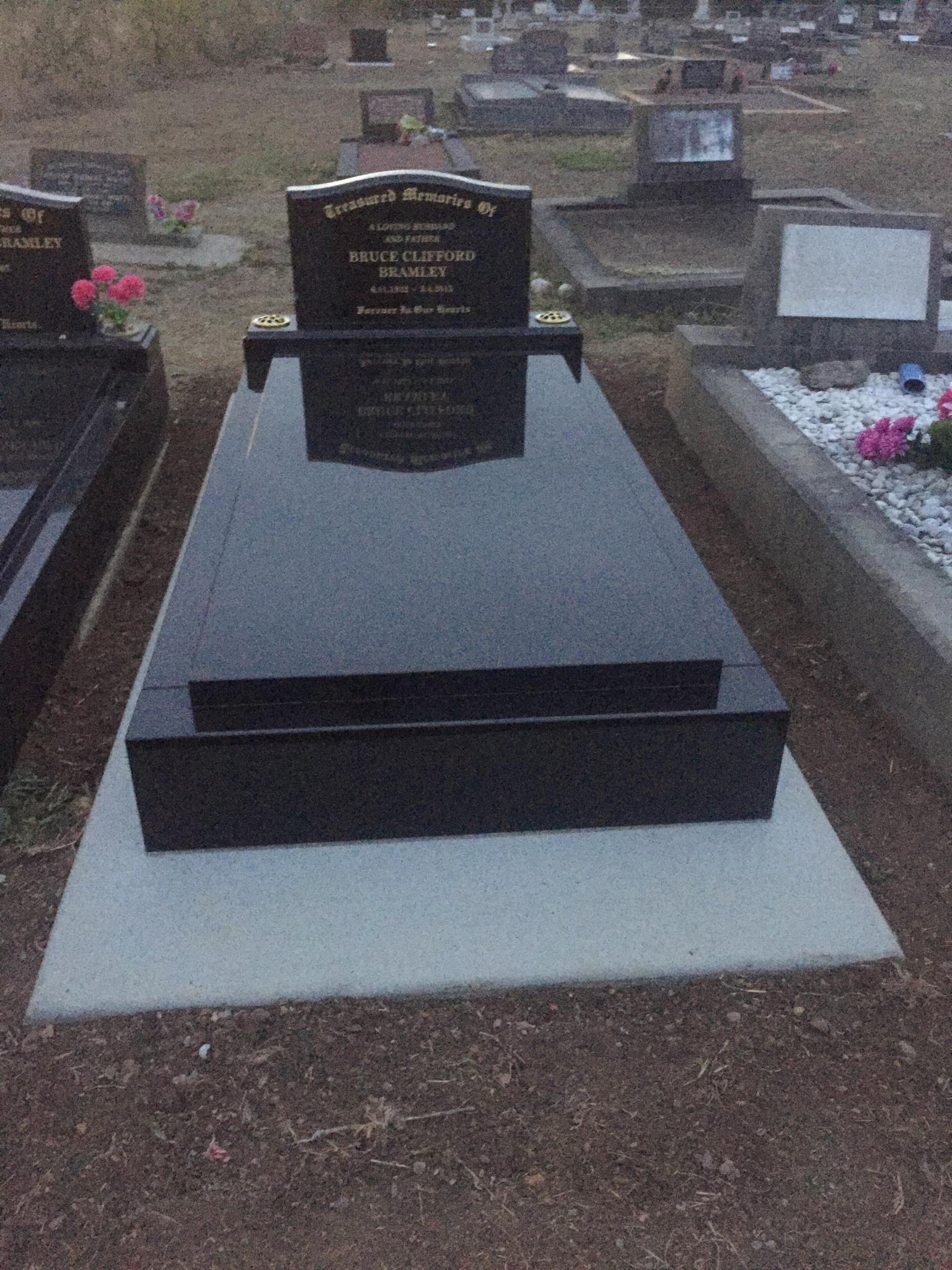 Small black granite memorial including plate, kerbs and ledgers. Gold inscription