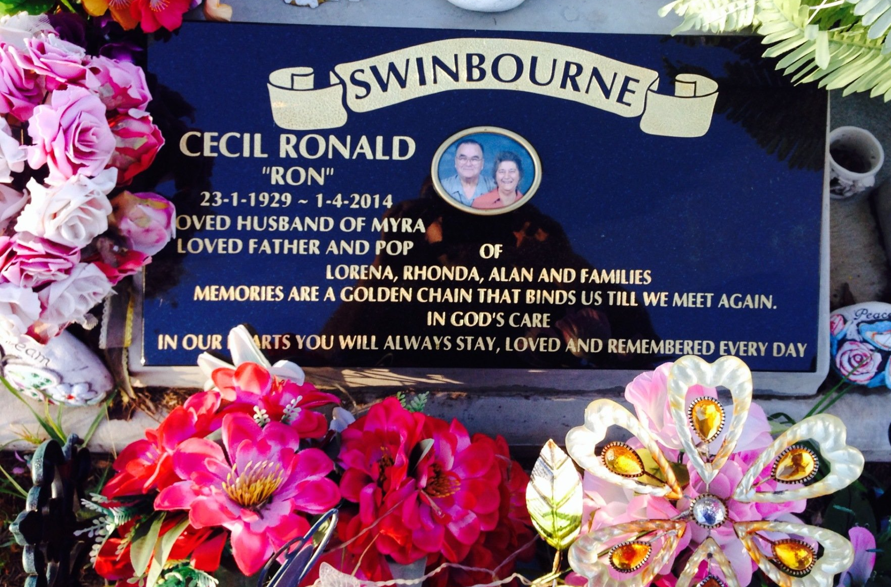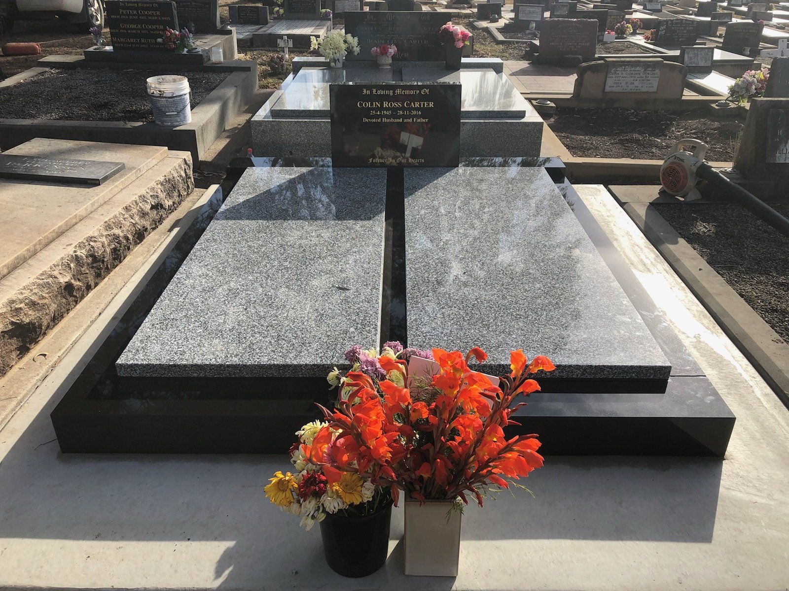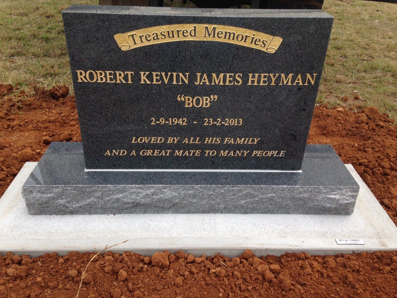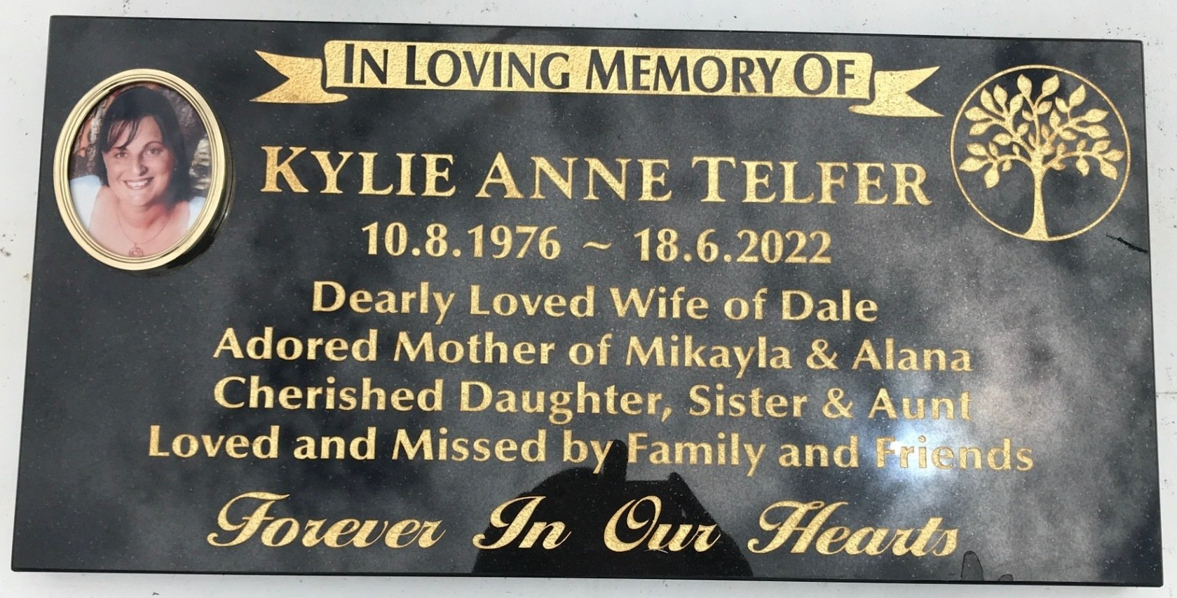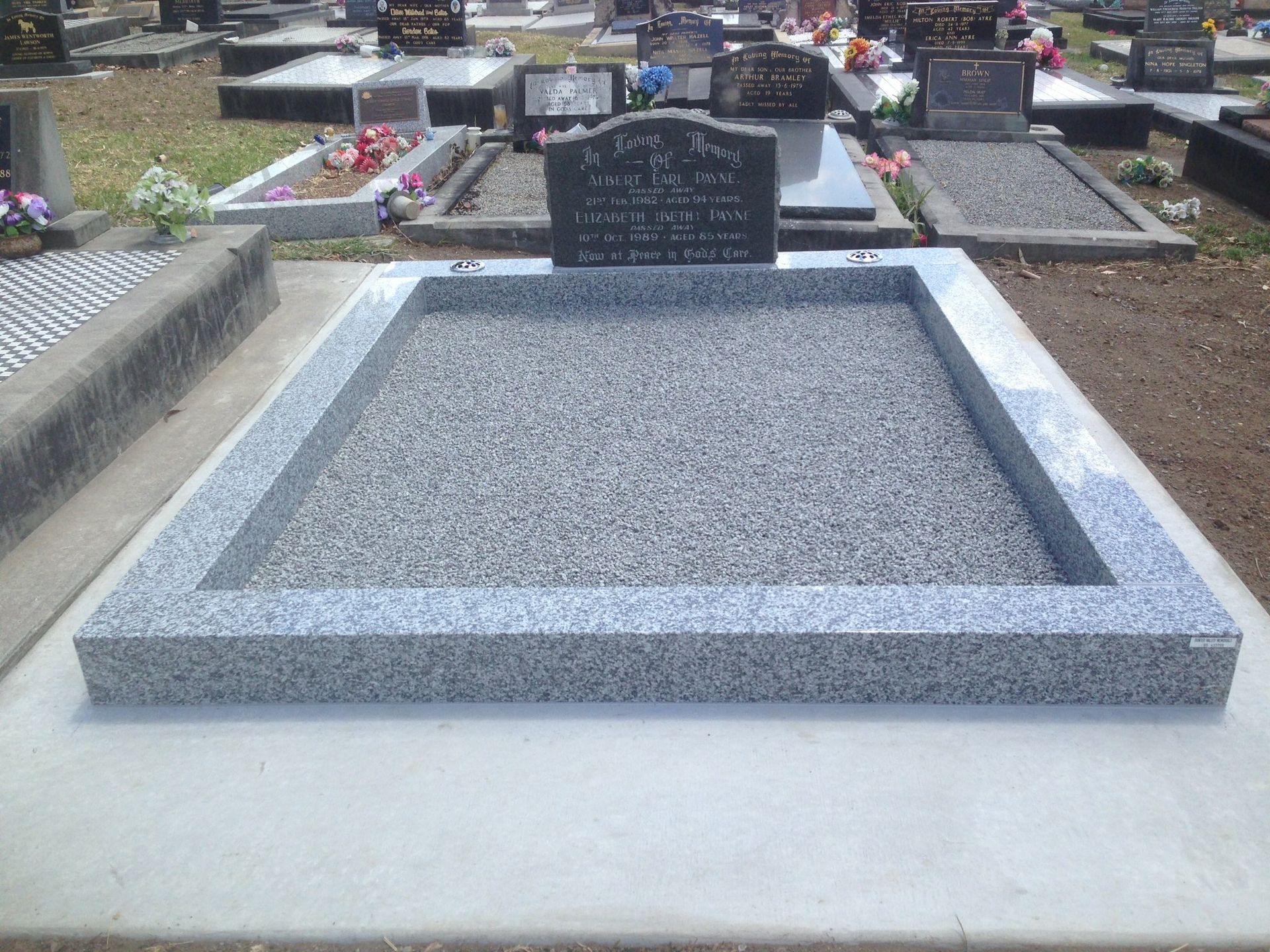 Small black granite memorial including plate, kerbs and ledgers. Gold inscription