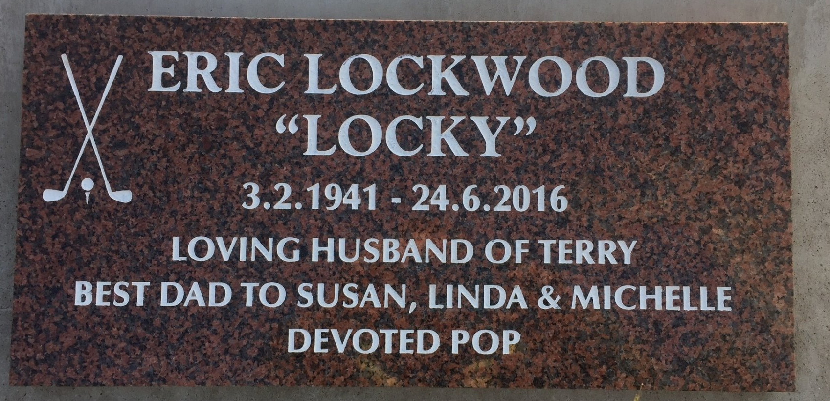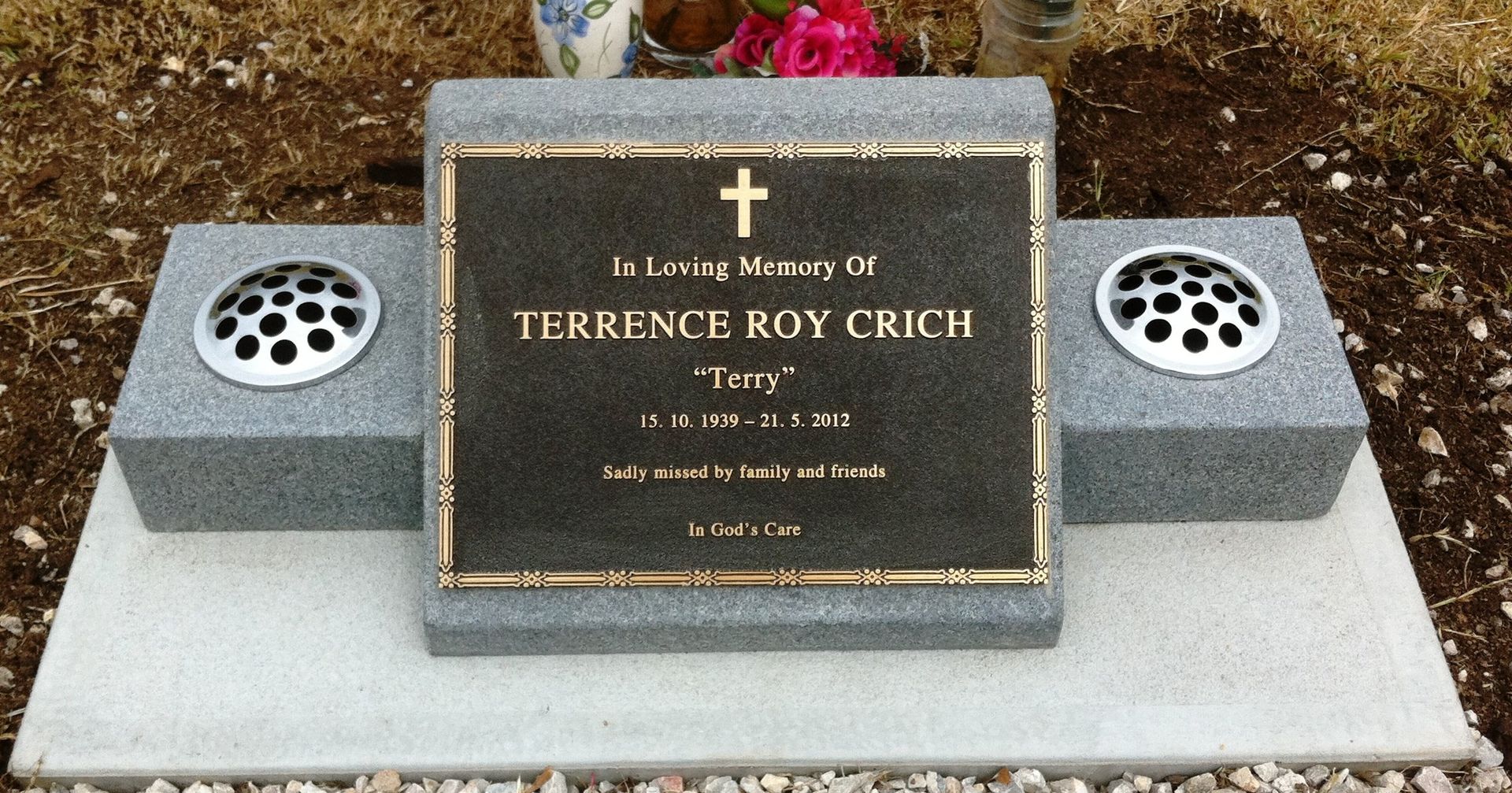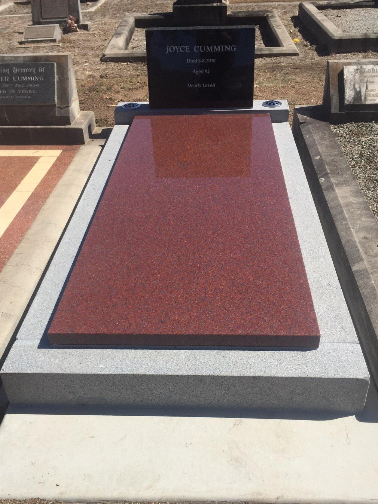 Small red granite chip memorial with a red granite panel and gold inscription