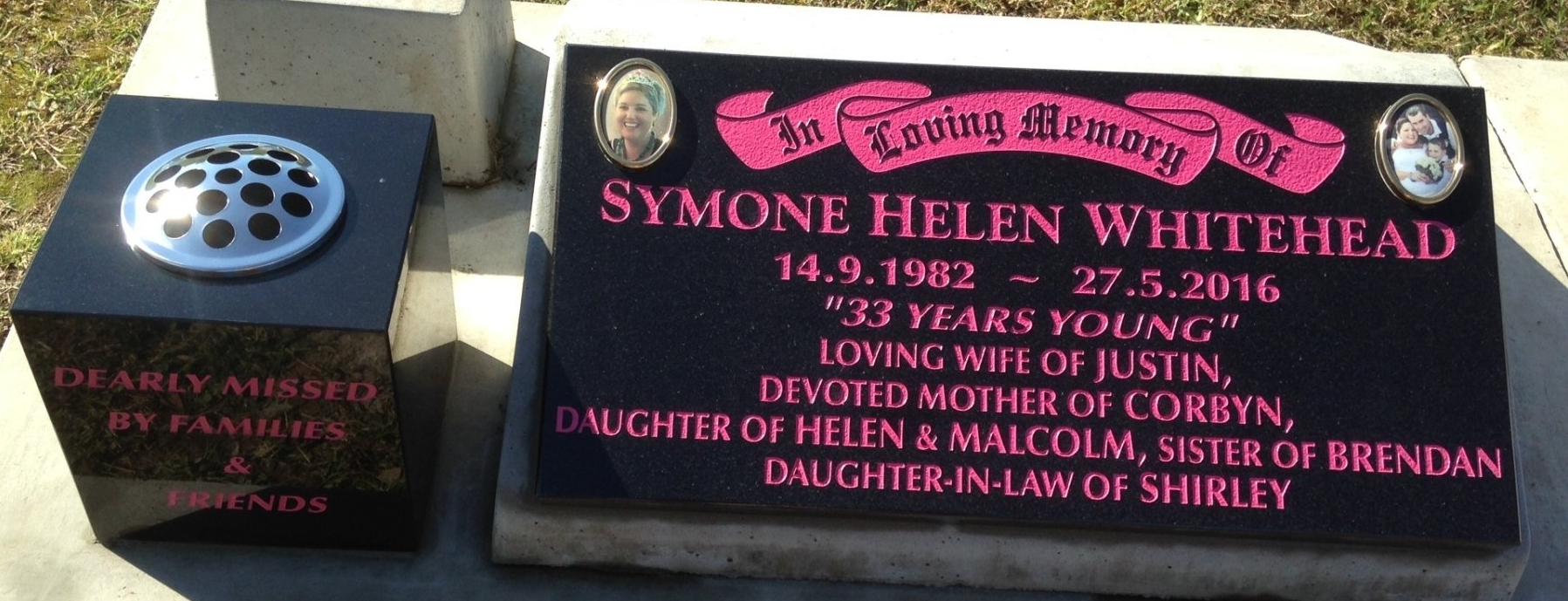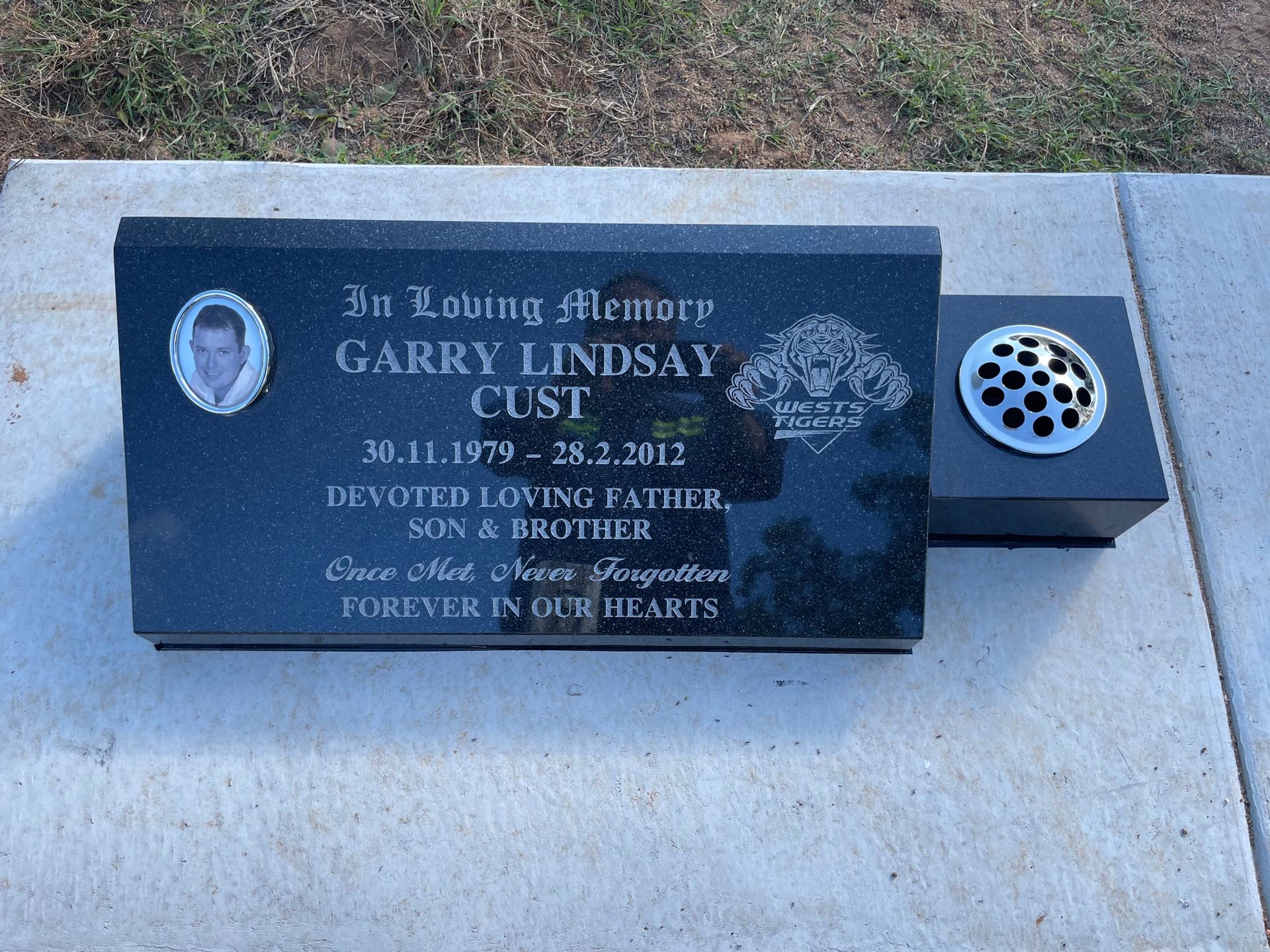 Small black all polished plate and base with vases set on a concrete path. Gold inscription