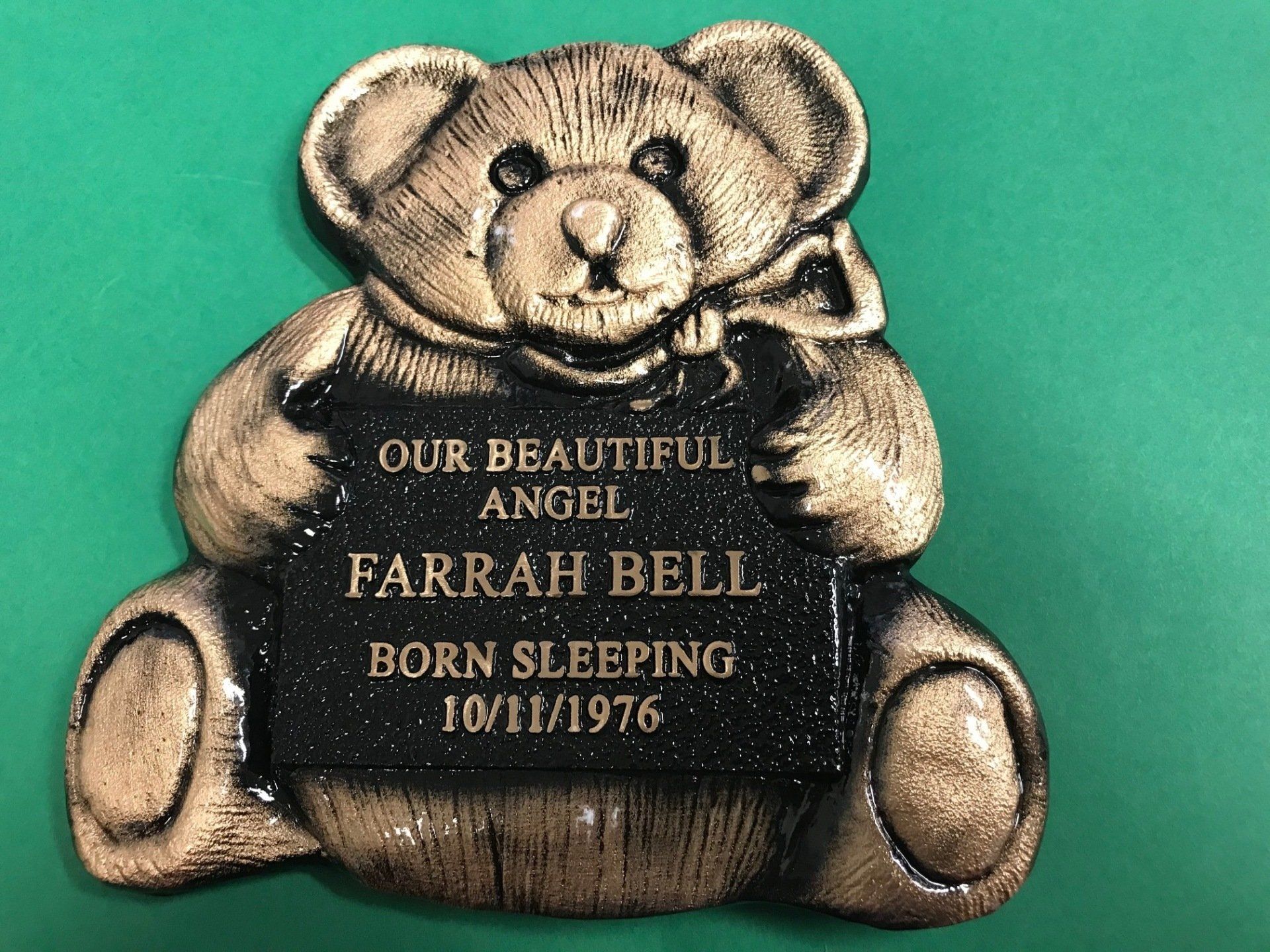 Small blue bronze plaque with ceramic teddy bear on a sloper desk